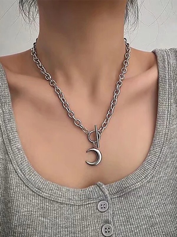 Silver Crescent Moon Pendant Toggle Necklace