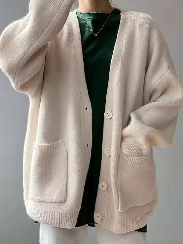 Solid V Neck Breasted Knit Cardigan