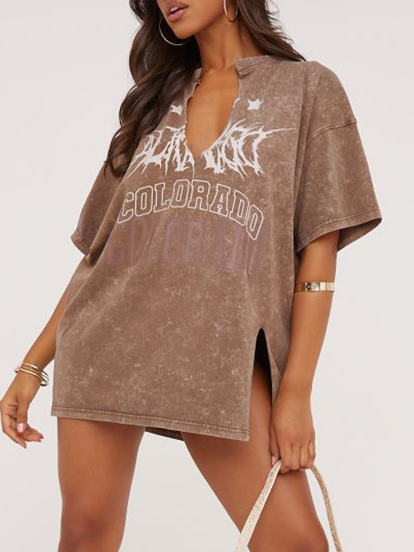 V Neck Letter Print Oversized Short Sleeve Tee