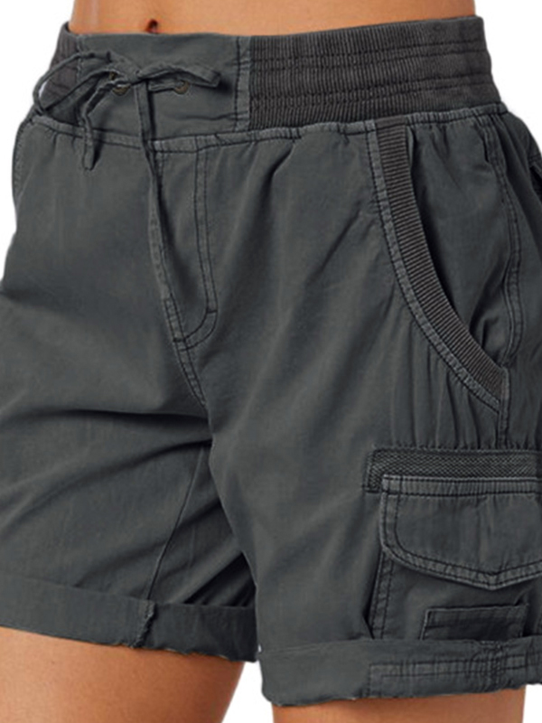 Solid Elastic Waist Multi Pocket Drawstring Shorts