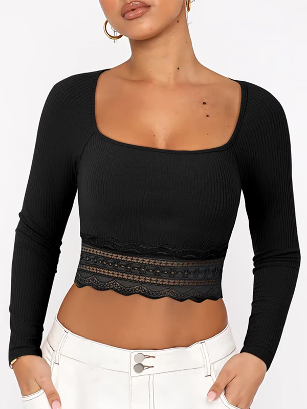 Solid Color Lace Hem Square Neck Crop Long Sleeve Knit
