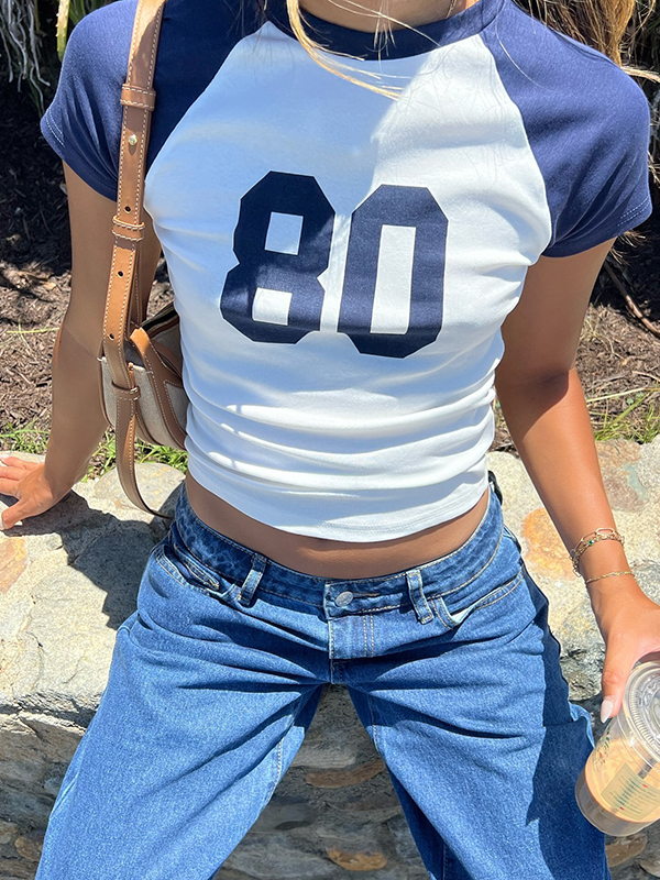 Number Letter Print Breasted Slim Long Sleeve Tee