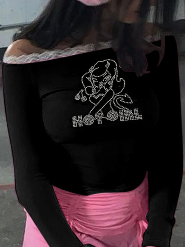 Cartoon Rhinestone Print Off Shoulder Lace Trim Long Sleeve Tee