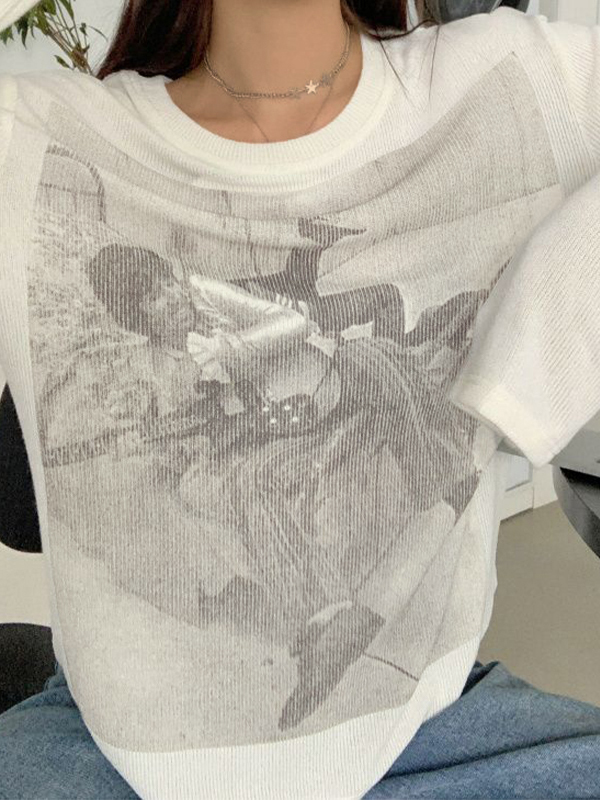 Vintage Print Ribbed Loose Long Sleeve Knit