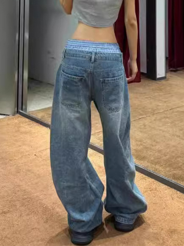 Designed Double Waistband Washed Wide Legs Boyfriend Jeans