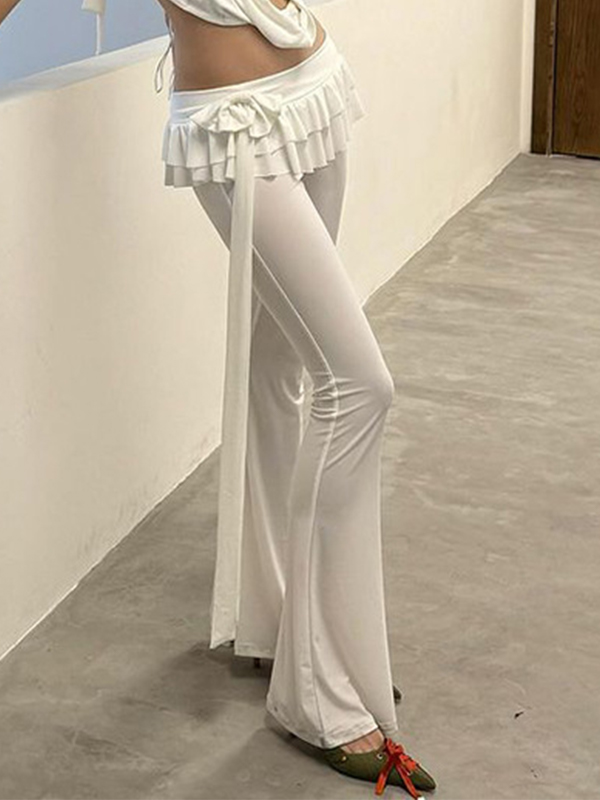 Solid Ruffled Trim Tie Up Flare Leg Pants